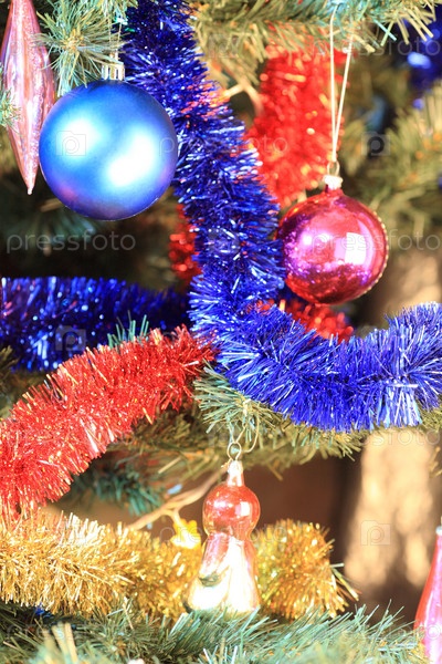 Игрушки на зеленой рождественской ели
