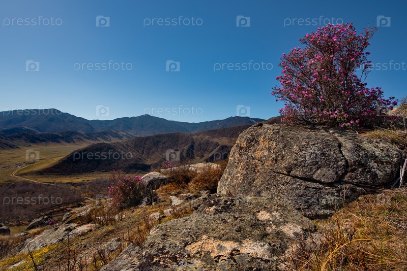 Россия. Юг Западной Сибири, весенние цветы Горного Алтая. Рододендрон. Период его цветения - главное событие весны в Горном Алтае, которое привлекает множество туристов