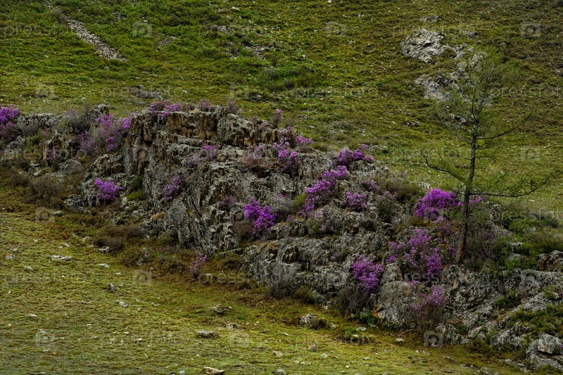 Россия. Юг Западной Сибири, весенние цветы Горного Алтая. Рододендрон. Период его цветения - главное событие весны в Горном Алтае, которое привлекает множество туристов