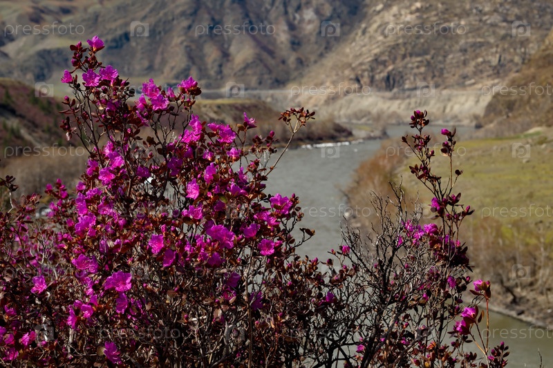 Россия. Юг Западной Сибири, весенние цветы Горного Алтая. Рододендрон. Период его цветения - главное событие весны в Горном Алтае, которое привлекает множество туристов