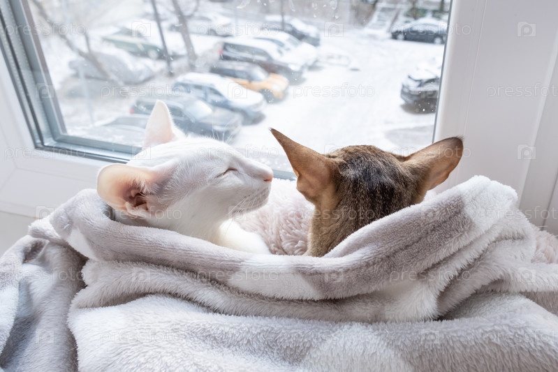 Симпатичный восточный короткошерстный полосатый котенок и белый ориентальный кот смотрят в окно на зимней улице
