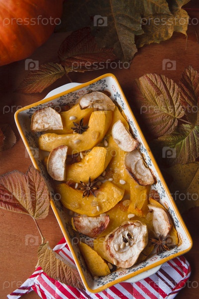 Ломтики тыквы, запеченные в духовке с яблоком, изюмом, кедровыми орехами и специями, апельсиновый стол, осенние листья