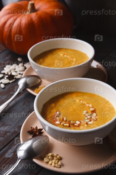 Две белые тарелки тыквенного супа на розовых тарелках со свежей тыквой и тыквенными семечками на темном деревянном фоне, выборочный фокус
