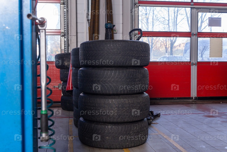 Комплект шин для сезонной замены возле подъемника в шиномонтажной мастерской