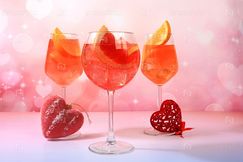 Праздничный алкогольный коктейль Aperol spritz в стаканах и любовных сердцах, концепция бара и День святого Валентина, спиртные напитки на вечеринке, реклама ресторана,