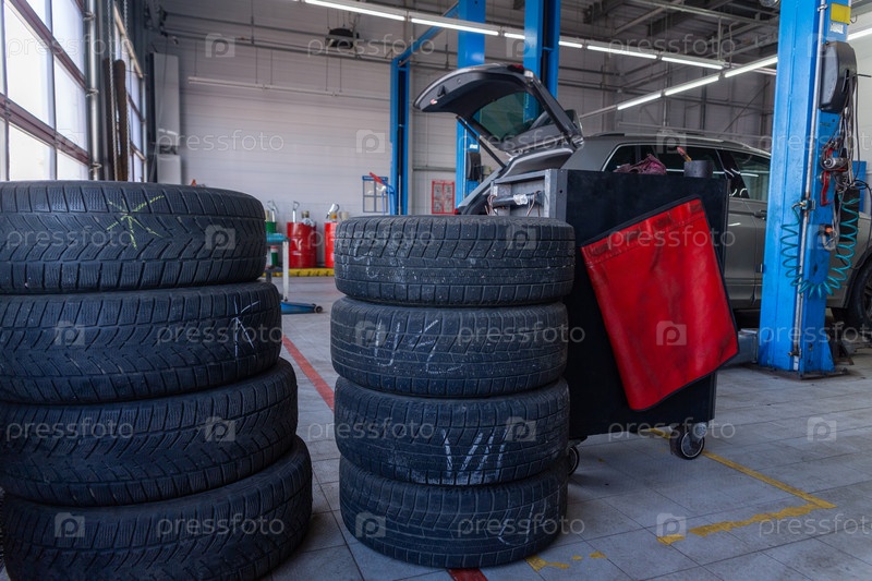 Комплект шин для сезонной замены возле подъемника в шиномонтажной мастерской. Концепция сезонной замены автомобильных шин