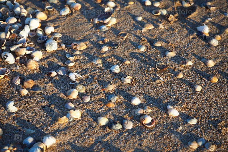 Маленькие ракушки на песчаном пляже. Природный фон побережья Азовского моря