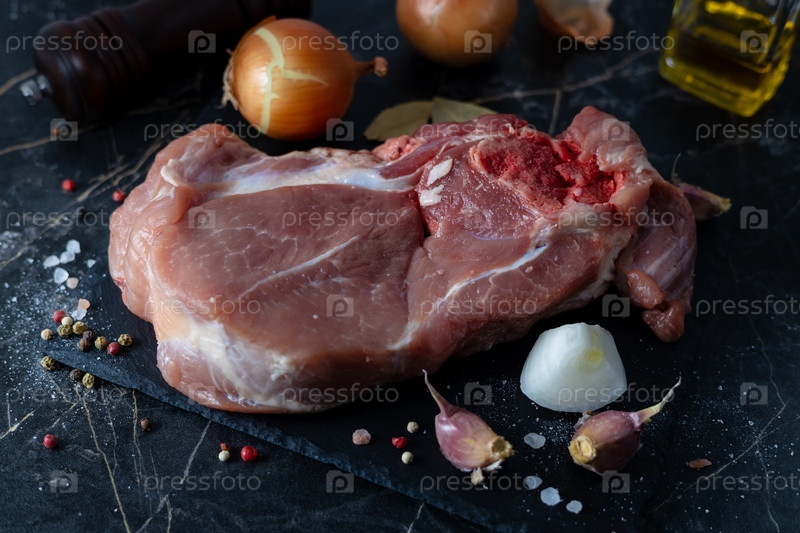 Кусок свиного стейка со специями и луком на черной разделочной доске
