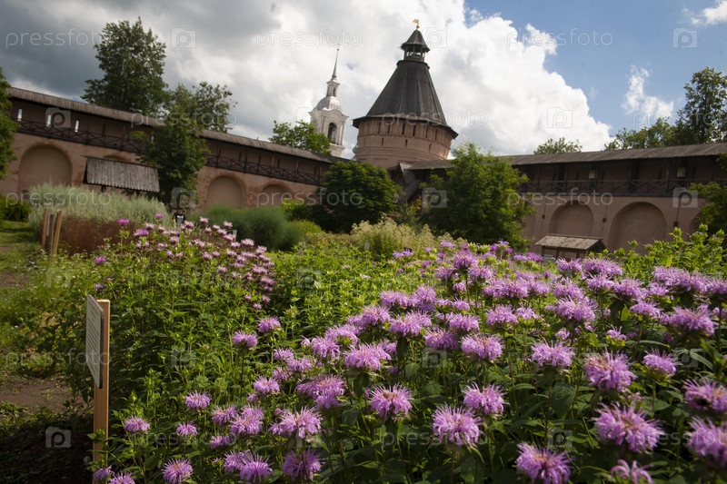 Цветы мелиссы (монарды) в травяном саду Спасо-Ефимиева монастыря в Суздале, Россия