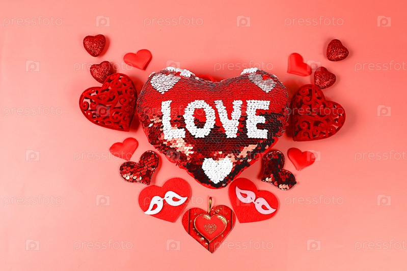 Празднование Дня святого Валентина или Женского дня, Дня матери, баннера. Поздравительная открытка, набор красных сердечек на пастельном фоне, поздравления с праздником, днем рождения