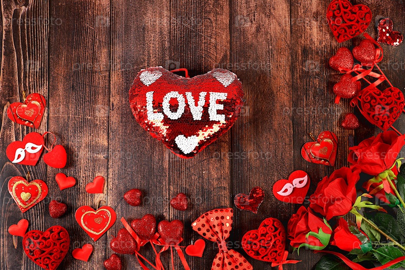 День святого Валентина или женский день, концепция Дня матери, баннер. Поздравительная открытка, красные сердца и розы на деревянном фоне, с праздником, поздравления с днем рождения,