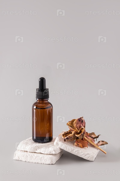 Увлажняющая сыворотка для ухода за кожей лица стоит на кусочках белого кирпича с засушенным цветком. Антивозрастной уход. Вертикальный вид. упаковка, макет