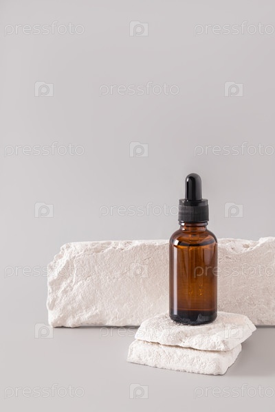 Классический косметический флакон с пипеткой из темного стекла стоит на двух ломтиках белого кирпича. Пустой макет бутылки для презентации продукта. Вертикальный вид