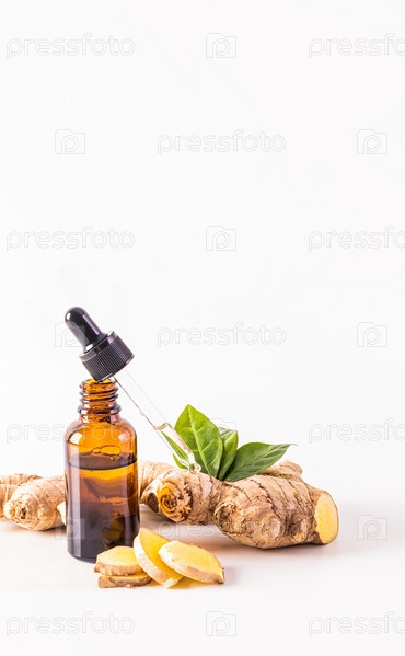 Открытая косметическая бутылочка со средством по уходу за волосами на основе имбирного масла и наполненная им пипетка. тонизирующее и антисептическое. Вертикальный вид. белый фон