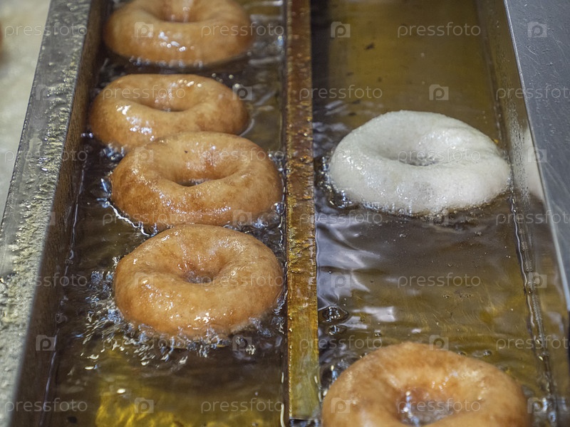 Приготовление жареных сладких вкусных пончиков в горячем масле во фритюрнице