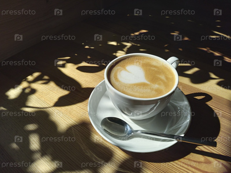 Вид сверху на чашку ароматного кофе на завтрак на деревянном столе и оставляет тень вокруг, утро