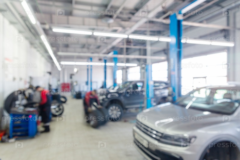 Размытое изображение внутри шиномонтажного центра. Замена резины на колесах автомобиля. Балансировка колес. Центр обслуживания автомобильных шин авторемонтная мастерская размытый фон