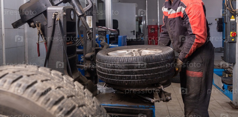 Автомеханик меняет шину на ободе в сервисном гараже. Крупный план механика в шиномонтажной мастерской, меняющего шины