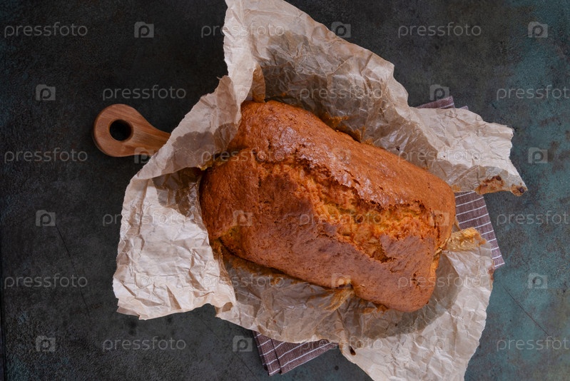 Свежий кекс или хлеб на пергаменте. Домашняя выпечка