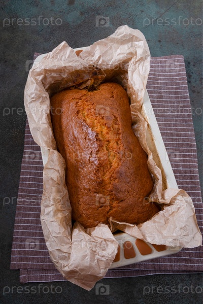 Свежий кекс или хлеб на пергаменте. Домашняя выпечка