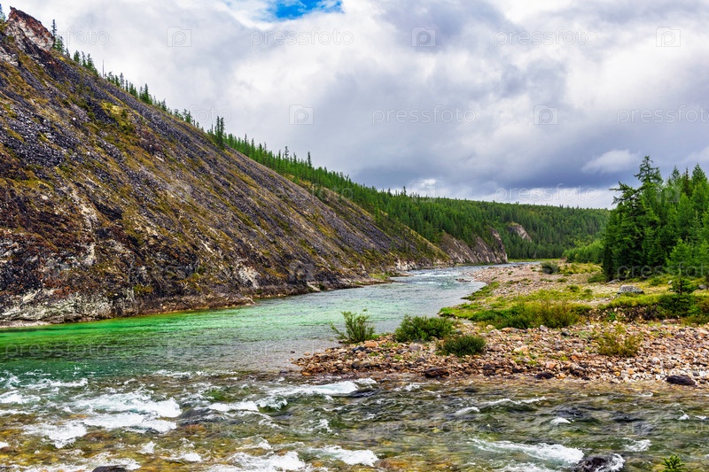 Северная река, текущая среди скал в лесной местности