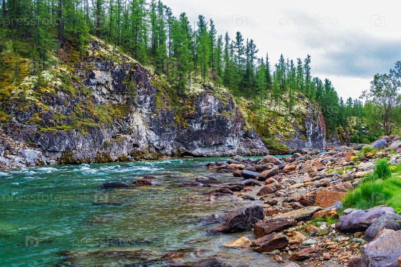 Северная река, текущая среди скал в лесной местности