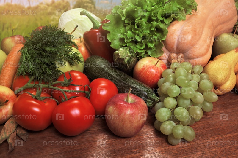 Различные свежие овощи и фрукты на деревянном дубовом столе
