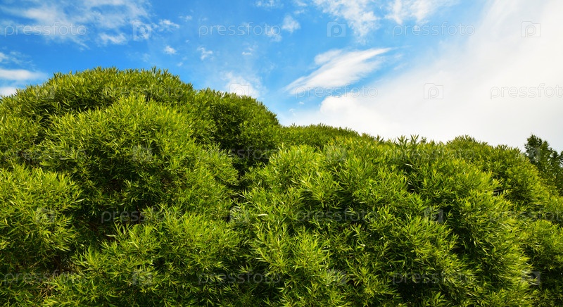 Зеленый куст на фоне голубого неба, сочная листва