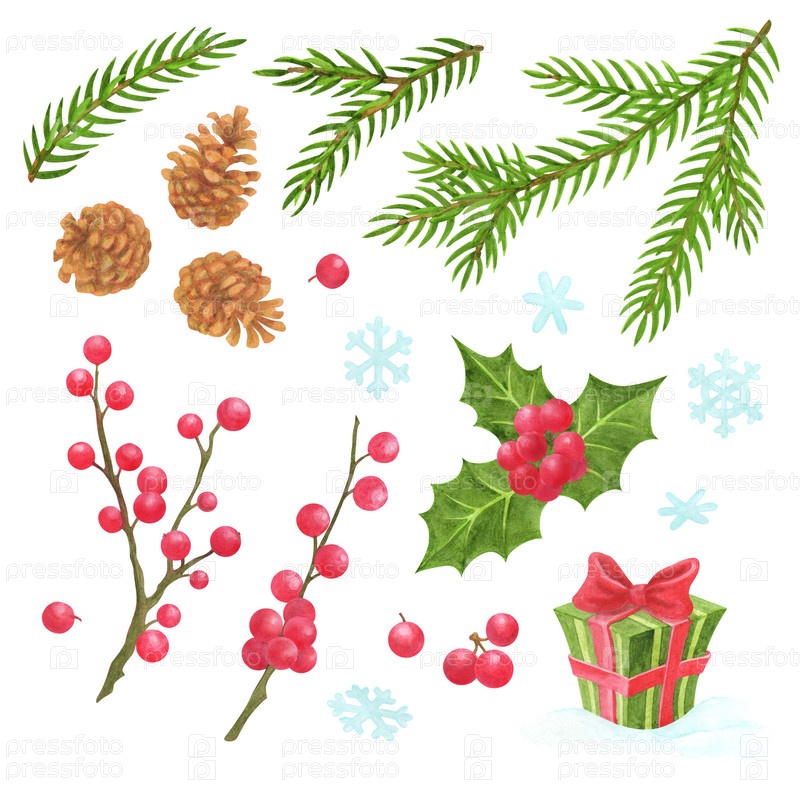 Набор элементов дизайна рождественских тканей, упаковки или печати. Акварельные хвойные веточки, ягоды падуба, шишки, снежинки и подарок. Изолированный акварельный клипарт