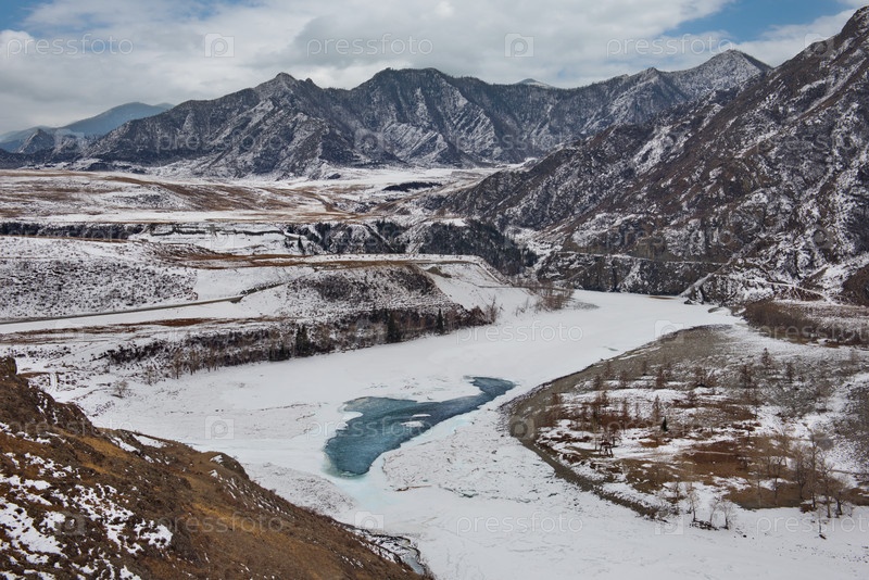 Россия, Горный Алтай. Вид на реку Катунь с весенним льдом в окружении заснеженных гор