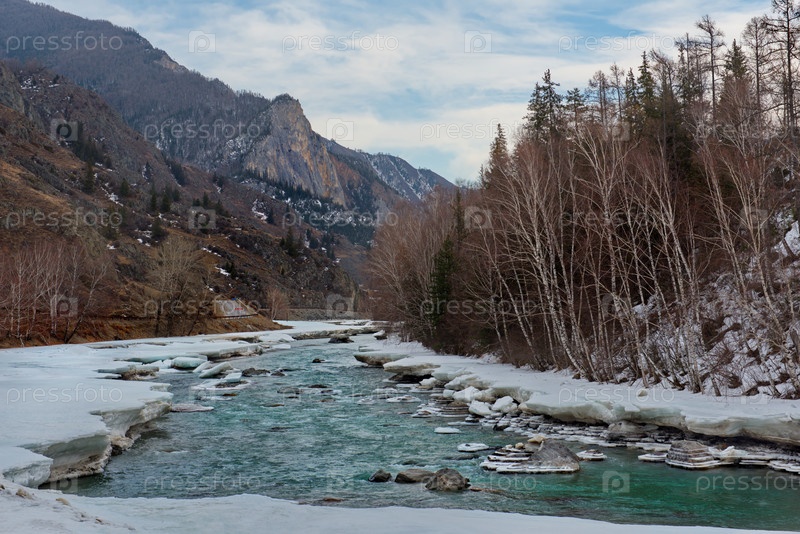 Россия, Горный Алтай. Вид на реку Катунь с весенним льдом в окружении заснеженных гор