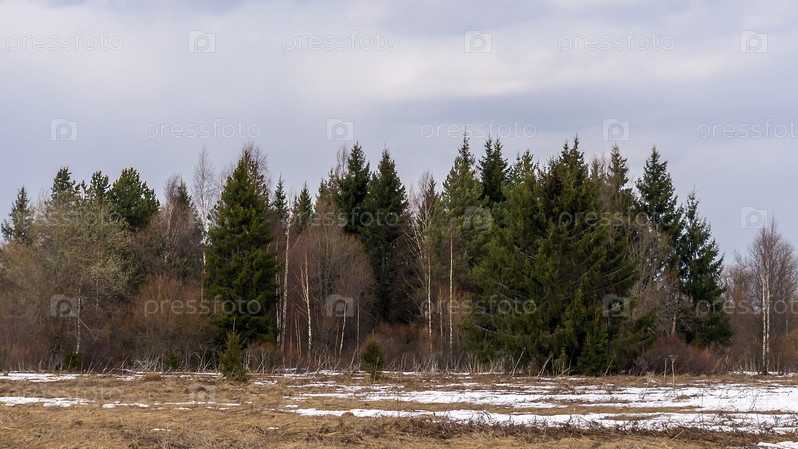 Ранняя весна, на поляне еще не растаял снег. По краю растут лиственные и хвойные деревья