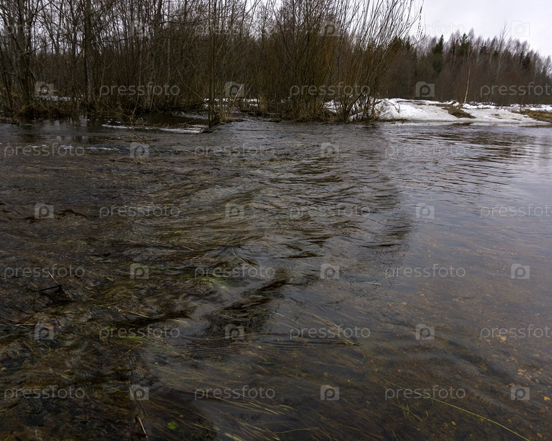 Ранней весной река вышла из берегов и затопила лес. Наводнение