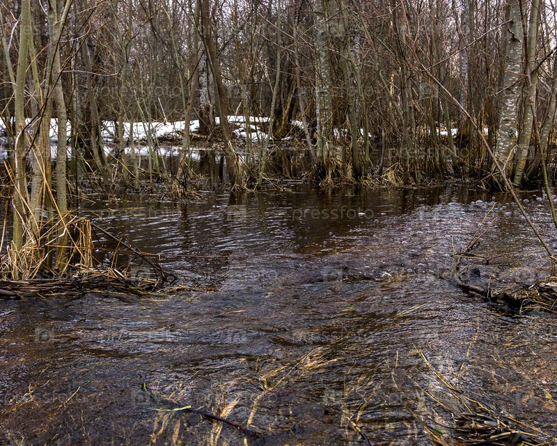 Ранней весной река вышла из берегов и затопила лес. Наводнение
