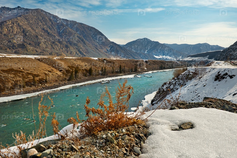 Россия, Горный Алтай. Вид на реку Катунь с весенним льдом в окружении заснеженных гор