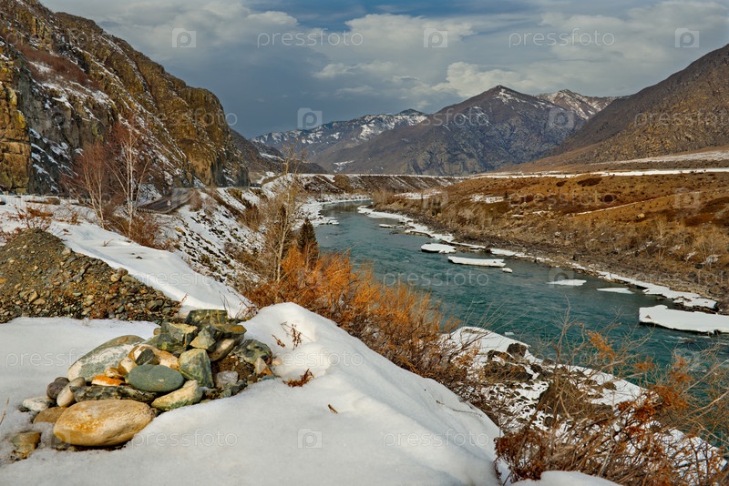 Россия, Горный Алтай. Вид на реку Катунь с весенним льдом в окружении заснеженных гор