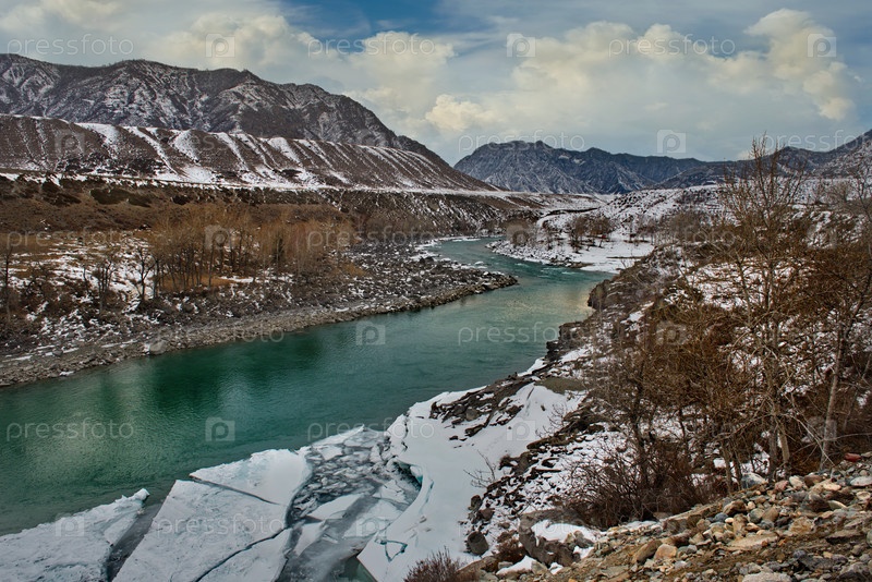 Россия, Горный Алтай. Вид на реку Катунь с весенним льдом в окружении заснеженных гор