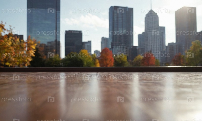 Красивый деревянный стол на фоне офиса. Бизнес-подиум для презентации продукта