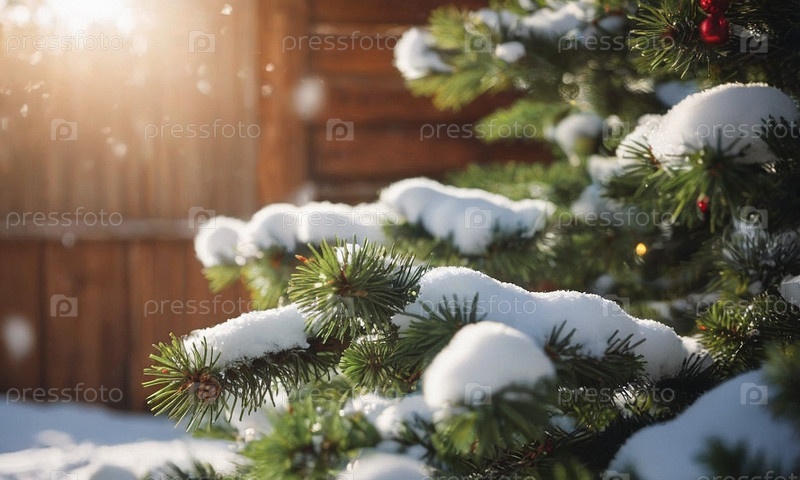 Украшенная елка в снегу. Солнечный зимний новогодний пейзаж