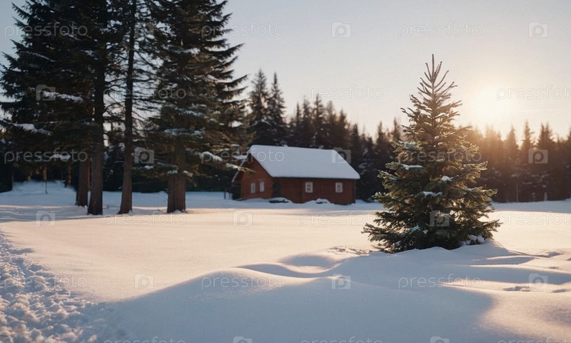Украшенная елка в снегу. Солнечный зимний новогодний пейзаж