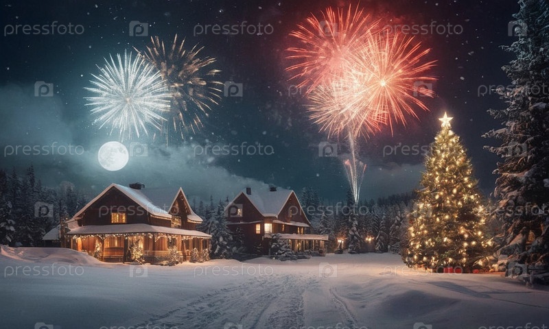 Уютный зимний пейзаж с яркими домиками в снегу. Светящаяся елка и фейерверк