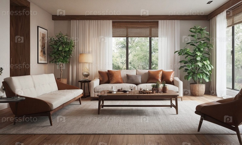 Минималистичный скандинавский дизайн уютного дома с камином. Светлый интерьер с элементами дерева