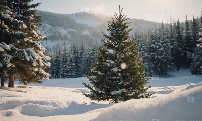 Украшенная елка в снегу. Солнечный зимний новогодний пейзаж