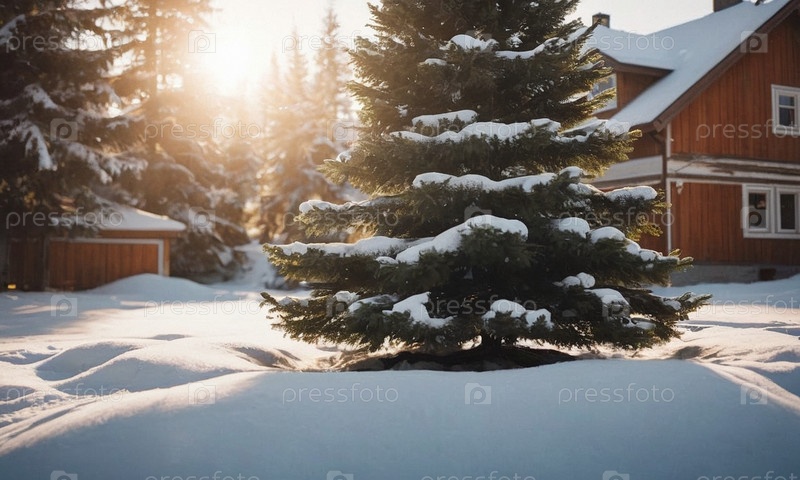 Украшенная елка в снегу. Солнечный зимний новогодний пейзаж