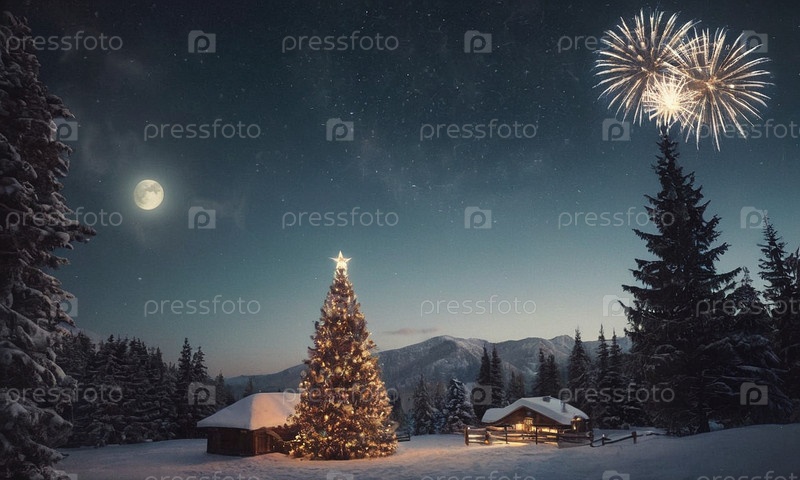 Уютный зимний пейзаж с яркими домиками в снегу. Светящаяся елка и фейерверк