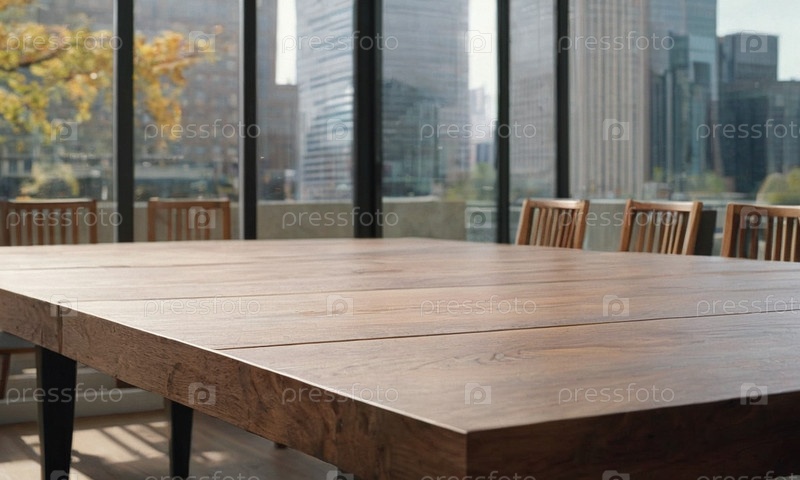 Красивый деревянный стол на фоне офиса. Бизнес-подиум для презентации продукта