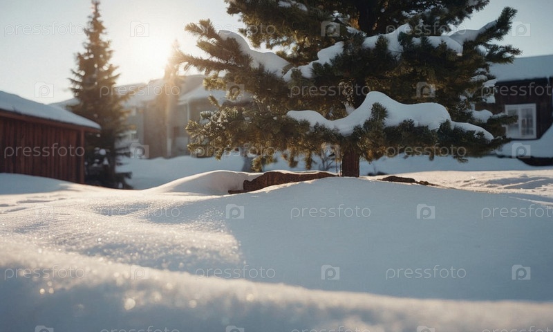 Украшенная елка в снегу. Солнечный зимний новогодний пейзаж
