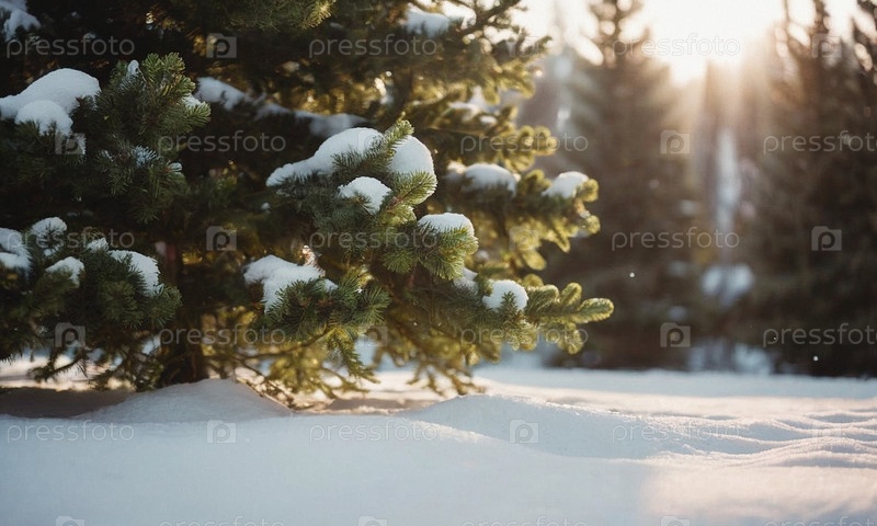 Украшенная елка в снегу. Солнечный зимний новогодний пейзаж