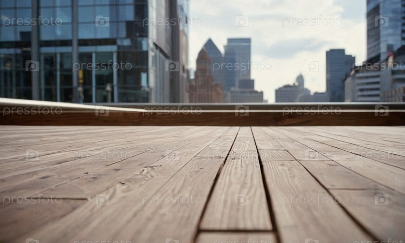 Красивый деревянный стол на фоне офиса. Бизнес-подиум для презентации продукта