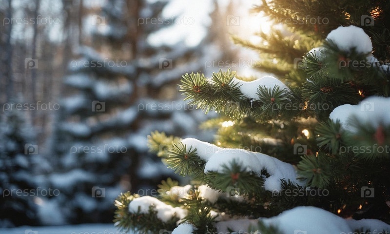 Украшенная елка в снегу. Солнечный зимний новогодний пейзаж